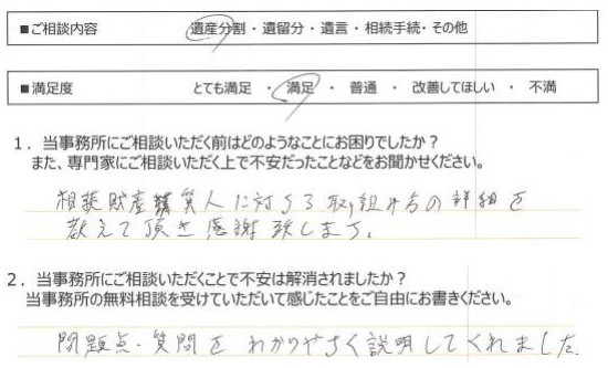 先日、相続手続きのご依頼をいただいたお客様より、アンケートへのご回答を頂戴しました。 ご相談前は「相続について」漠然としたご不安を抱えていらっしゃいました 。 当事務所にご相談いただいた結果、「親身になって相談にのっても […]