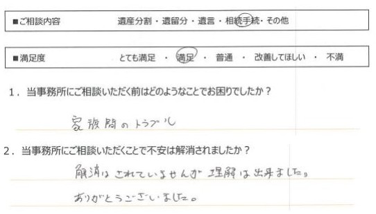 先日、相続のご相談をいただいたお客様より、アンケートへのご回答を頂戴しました。 ご相談前は「弁護士費用が心配」とのご不安を抱えていらっしゃいましたが、当事務所にご相談いただいた結果、「不安はほとんど解消出来ました。自分で […]